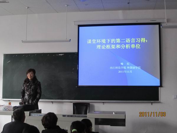 2011年11月3日14:30,太阳成集团tyc234cc喻红副教授在一教202教室为国培参训教师作了一场题为“课堂环境下的第二语言习得:理论框架和分析单位”的理论研讨讲座。
