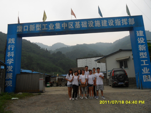7月18日,团队安排社会实践调查活动。当天上午,支教团队在当地员工的引导下,到漩口镇附近的羌寨做客、家访,了解当地的民俗民情。下午,团队又走访了当地工业园区。漩口镇是汶川县工业集聚区,现有工矿企业15家,以建材、冶金、采矿、加工为主,主要分布在集镇内的古溪沟两旁。据了解,漩口片区将重点打造铝业、锂业、医药、电子科技、磁材、建材及机械制造加工(电线电缆)等产业,以此来促进本地区经济的发展,从而带动文化、教育和公共卫生事业的发展。