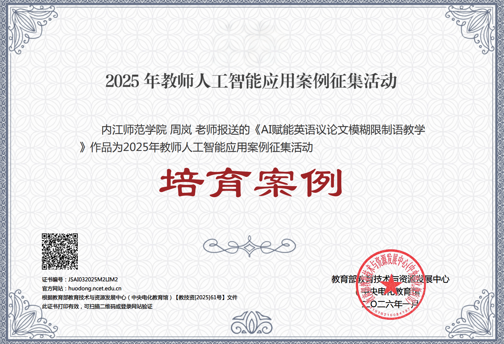 近日,教育部教育技术与资源发展中心(中央电化教育馆)公布2025年教师人工智能应用案例征集活动结果。公司教师周岚申报的《AI赋能英语议论文模糊限制语教学》案例获评高等教育组培育案例,展现了太阳成集团tyc234cc在推动公司产品数字化转型、深化人工智能与课程教学融合方面取得的阶段性成效。