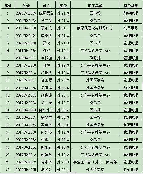 经各勤工助学用人单位评选,员工资助管理中心审核,拟定外国语公司陈易民名等22名同学为公司2021-2022学年度勤工助学员工,现将名单进行公示如下: